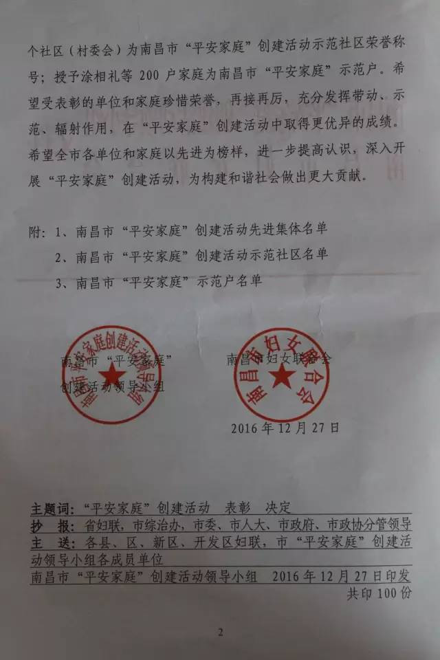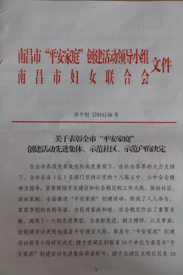12月29日下午,南昌市妇女联合会组织的“汇聚巾帼力量 共建幸福家园”——“平安家庭”创建活动现场推进会在我市红谷滩新区世纪中央城社区成功召开,对今年在“平安家庭”创建活动中表现突出的先进集体、示范社区和“平安家庭”标兵户、示范户进行了表彰。西湖区妇联、南昌仁爱妇产医院等30个单位荣获南昌市“平安家庭”创建活动“先进集体”荣誉称号。